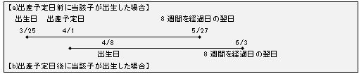 □*2「産後期間」について、a)出産予定日前に当該子が出生した場合にあっては当該「出生の日」から当該出産予定日から起算して8週間を経過する日の翌日までとし、b)出産予定日後に当該子が出生した場合にあっては当該「出産予定日」から当該出生の日から起算して8週間を経過する日の翌日までとする。