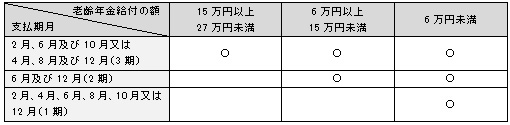 □*2 老齢年金給付の額が27万円に満たない場合における当該老齢年金給付の支払期月は、規約で定めるところにより、当該老齢厚生年金の支払期月の例による月又は次に掲げる当該老齢年金給付の額の区分に応じ、それぞれ当該定める月とする(基金令28条2項)。