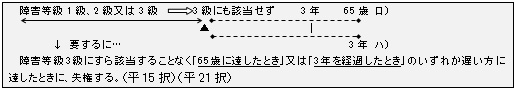 ロ) 障害等級に該当する程度の障害の状態にない者が、65歳に達したとき。ただし、65歳に達した日において、障害等級に該当する程度の障害の状態に該当しなくなった日から起算して障害等級に該当する程度の障害の状態に該当することなく3年を経過していないときを除く。(平7択)(平16択)
