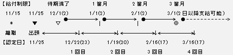 □1回目の失業認定日(12月23日)に出頭し、待期期間の満了確認を受けたあとは、4回目の失業認定日(3月17日)において、待期期間満了後の期間につき、初めての基本手当の支給認定となる。