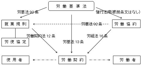 就業規則は、法令又は当該事業場について適用される労働協約に反してはならず、また、行政官庁(所轄労働基準監督署長)は、法令又は労働協約に抵触する就業規則の変更を命ずることができる。