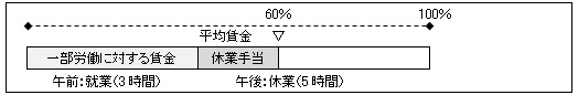 □*4 「1労働日の一部」を休業した場合において、労働した時間相当の賃金が支払われていても、その日につき、実際に支給された賃金の額が平均賃金の100分の60に達しない場合には、その差額を支給しなければならない(昭27.8.7基収3445号)。(平9択)