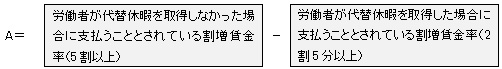 □1箇月について60時間を超えて延長して労働させた時間の時間数に、労働者が代替休暇を取得しなかった場合に当該時間の労働について法37条1項但し書の規定により支払うこととされている割増賃金の率と、労働者が代替休暇を取得した場合に当該時間の労働について同項本文の規定により支払うこととされている割増賃金の率との差に相当する率(「換算率」という)を乗じるものとする。