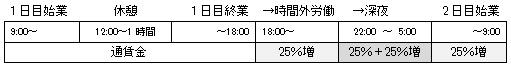 使用者が、午後10時から午前5時まで*1(厚生労働大臣が必要であると認める場合においては、その定める地域又は期間については午後11時から午前6時まで)の間において労働させた場合においては、その時間の労働については、通常の労働時間の賃金の計算額の2割5分以上の率*2で計算した割増賃金を支払わなければならない。