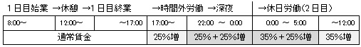 【具体例】始業時刻が午前8時、終業時刻が午後5時、休憩時間が正午から午後1時までの事業場において、徹夜残業を行い、翌日の法定休日の正午において当該残業が終了した場合