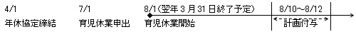 (例)「分割付与」として、4月1日に入社した者に入社時に5労働日、法定の基準日である10月1日に5労働日付与し、次年度の基準日は、本来翌年10月1日であるが、初年度にその付与日数の一部を法定の基準日以前に6箇月繰り上げたことから、同様に6箇月繰り上げ、翌年4月1日に11労働日付与する場合