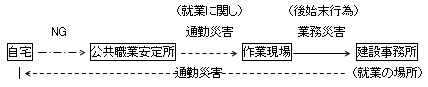 (例)内勤職の者が特命(特別の指示)を受けて、通勤途上において職務を遂行する場合は、「出張」のケースと同じく「通勤途上」も含めて業務遂行性が認められる