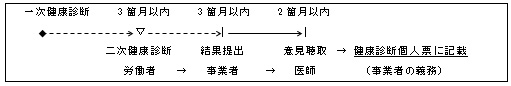 □二次健康診断を受けた労働者から当該二次健康診断の実施の日から3箇月を超えない期間内に、当該二次健康診断の結果を証明する書面の提出を受けた事業者(労働安全衛生法に規定する事業者をいう)は、二次健康診断の結果(当該二次健康診断の項目に異常の所見があると診断された労働者に係るものに限る)に基づき、当該労働者の健康を保持するために必要な措置について、医師の意見を聴かなければならない(法27条、則18条の17、労働安全衛生法66条の4)。