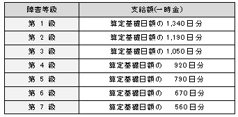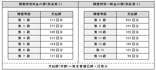 障害特別一時金は、障害(補償)一時金の受給権者に対し、その申請に基づいて支給するものとし、その額は、当該障害(補償)一時金に係る障害等級に応じ、特支則別表第3に規定する額*2とする。