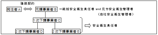1) 事業者で、一の場所において行う事業の仕事の一部を請負人に請け負わせているもの(当該事業の仕事の一部を請け負わせる契約が2以上あるため、その者が2以上あることとなるときは、当該請負契約のうちの最も先次の請負契約における注文者とする、以下「元方事業者」という)のうち、建設業その他政令で定める業種に属する事業*1(以下「特定事業」という)を行う者(以下「特定元方事業者」という)は、その労働者及びその請負人(元方事業者の当該事業の仕事が数次の請負契約によって行われるときは、当該請負人の請負契約の後次のすべての請負契約の当事者である請負人を含む、以下「関係請負人」という)の労働者が当該場所において作業を行うときは、これらの労働者の作業が同一の場所において行われることによって生ずる労働災害を防止するため、統括安全衛生責任者を選任し、その者に元方安全衛生管理者の指揮をさせるとともに、第30条第1項各号の事項*2を統括管理させなければならない。ただし、これらの労働者の数が政令で定める数未満*3であるときは、この限りでない。