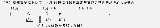 【解説】 見込額が増加した日の属する期(最初の期)の納期限は「4月15日」であり、「最初の期」と「次の期」の納期限が逆転することとなるので、4月15日までに4月1日~7月31日の期分(3月31日納付分)も合わせて納付すればよい。