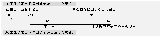 □*2「産後期間」について、a)出産予定日前に当該子が出生した場合にあっては当該「出生の日」から当該出産予定日から起算して8週間を経過する日の翌日までとし、b)出産予定日後に当該子が出生した場合にあっては当該「出産予定日」から当該出生の日から起算して8週間を経過する日の翌日までとする。