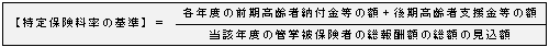 特定保険料率は、各年度において保険者が納付すべき前期高齢者納付金等の額及び後期高齢者支援金等の額(協会が管掌する健康保険及び日雇特例被保険者の保険においては、その額から法153条及び法154条の規定による国庫補助額を控除した額)の合算額(前期高齢者交付金がある場合には、これを控除した額)を当該年度における当該保険者が管掌する被保険者の総報酬額の総額の見込額で除して得た率を基準として、保険者が定める。