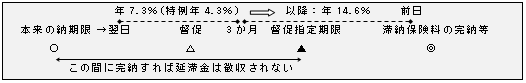 1) 前条第1項の規定によって督促をしたときは、保険者等は、徴収金額に、納期限の翌日から徴収金完納又は財産差押えの日の前日までの期間の日数に応じ、年14.6%(当該督促が保険料に係るものであるときは、当該納期限の翌日から3月を経過する日までの期間については、年7.3%(当分の間軽減措置あり*1))の割合を乗じて計算した延滞金を徴収する。
