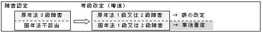 □第1項の(つまり、障害等級に該当する程度の障害の状態にない)障害基礎年金と同一の支給事由に基づく障害厚生年金又は障害共済年金について、その額が改定されたときは、そのときに第1項(事後重症による障害基礎年金)の請求があったものとみなす(4項)。 (平22択)