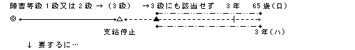 ハ) 厚生年金保険法に規定する障害等級に該当する程度の障害の状態に該当しなくなった日から起算して障害等級に該当する程度の障害の状態に該当することなく3年を経過したとき。ただし、3年を経過した日において、当該受給権者が65歳未満であるときを除く。