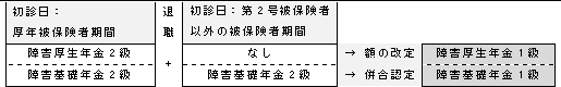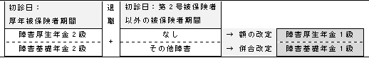 1) 障害厚生年金(その権利を取得した当時から引き続き障害等級の1級又は2級に該当しない程度の障害の状態にある受給権者に係るものを除く)の受給権者が、国民年金法による障害基礎年金(当該障害厚生年金と同一の支給事由に基づいて支給されるものを除く)の受給権を有するに至ったときは、当該障害厚生年金の支給事由となった障害と当該障害基礎年金の支給事由となった障害とを併合した障害の程度に応じて、当該障害厚生年金の額を改定する。 |