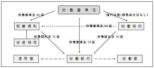 □労働者を拘束する(つまり、命令に従わせる)効力は、別途「労働協約」、「就業規則」または「労働契約」のいずれかに定めておくこととなる。
