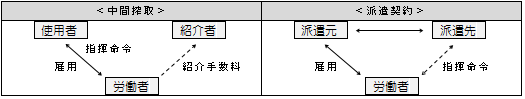□労働者派遣については、派遣元と労働者との間の労働契約関係及び派遣先と労働者との間の指揮命令関係を合わせたものが全体としてその労働者の労働関係となるものであり、したがって、派遣元による労働者派遣は、労働関係の外にある第三者が他人の労働関係に介入することとはならない(平11.3.31基発168号)。(平14択)