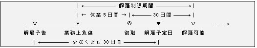 □30日前に解雇の予告をした場合であって、当該解雇予告期間満了の直前にその労働者が業務上負傷し又は疾病にかかり療養のために休業を要するときは、1日の軽度の負傷又は疾病であっても法19条(解雇制限)の適用があるが、当該休業したことによって、前の予告の効力の発生は停止されるだけであるから、治ゆした日に改めて解雇の予告をする必要はない(昭26.6.25基収2609号)。