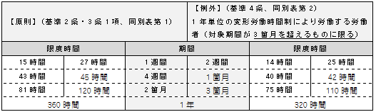 □*1「36協定で定める労働時間の延長の限度」は、次のそれぞれの場合において、中央欄に掲げる期間の区分に応じ、左右欄に掲げる限度時間を超えないものとしなければならない(延長の限度基準より)。