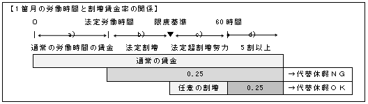 b) 労使協定を締結し、労働者が希望したときは、a)の金銭補償に代えて、通常の労働時間の賃金が支払われる休暇の付与による補償を行うことができる。→「代替休暇制度」の導入(法37条3項)