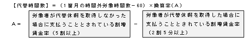 □1箇月について60時間を超えて延長して労働させた時間の時間数に、労働者が代替休暇を取得しなかった場合に当該時間の労働について法37条1項但し書の規定により支払うこととされている割増賃金の率と、労働者が代替休暇を取得した場合に当該時間の労働について同項本文の規定により支払うこととされている割増賃金の率との差に相当する率(「換算率」という)を乗じるものとする。