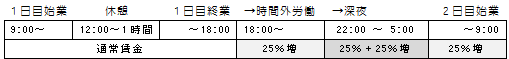 □継続勤務が2暦日にわたる場合であっても、当該勤務は始業時刻の属する日の労働として「1日」の労働とされるから、時間外労働が引き続き翌日の所定労働時間に及んだ場合には、翌日の所定労働時間の始期までの超過時間に対して割増賃金を支払うこととなる(平11.3.31基発168号)。