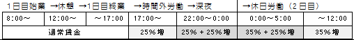 □*1「36協定」において休日の労働時間を8時間と定めた場合の割増賃金については、労働時間が8時間を超えても、深夜労働に該当しない限り、割増賃金率の基準は「3割5分」である(平11.3.31基発168号)。(平6択)