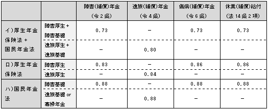 ハ) 同一の事由により、障害補償年金若しくは傷病補償年金又は遺族補償年金と国民年金法の規定による障害基礎年金又は遺族基礎年金若しくは寡婦年金とが支給される場合(イに規定する場合及び当該同一の事由により国家公務員共済組合法、地方公務員等共済組合法又は私立学校教職員共済法の規定による障害共済年金又は遺族共済年金が支給される場合を除く*2)(以下、省略)